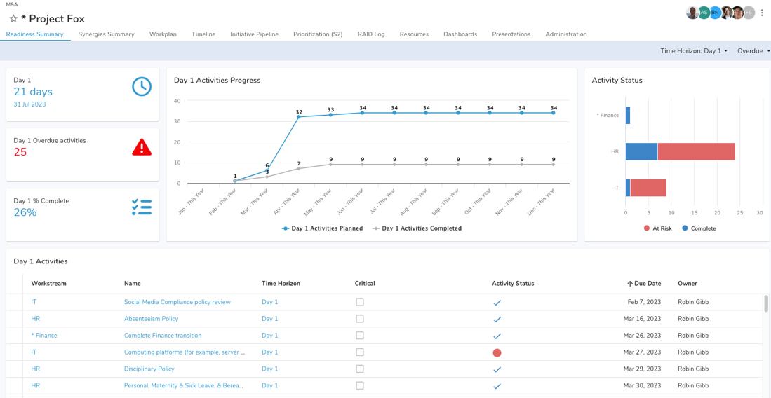 You want to achieve ambitious business outcomes from a merger, acquisition, or restructure — and complete integration activities and mitigate risk to a smooth Day 1. With our software, you can align your teams around integration workstreams and tasks, understand progress toward milestones, monitor TSAs, and measure synergies realized from a merger, acquisition, or divestiture.
