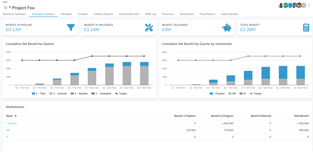 Validate whether your integration efforts have resulted in the expected outcomes. Access out-of-box reports showing the aggregated benefits and synergies across multiple initiatives and workstreams. Utilize real-time reporting to stay ahead of changes that may hinder a deal’s full potential.