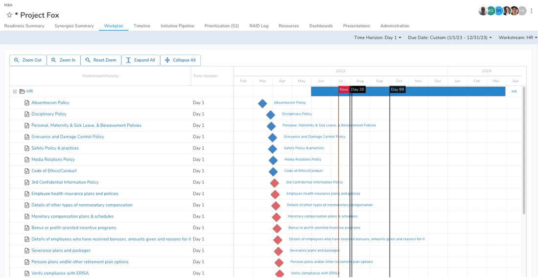 Define the key outcomes, timing, and success metrics for your integration effort and make detailed project plans aligned to your desired outcomes. Organize tasks into initiatives and higher-level work streams, business units, and geographies to enable a holistic view of your integration effort.